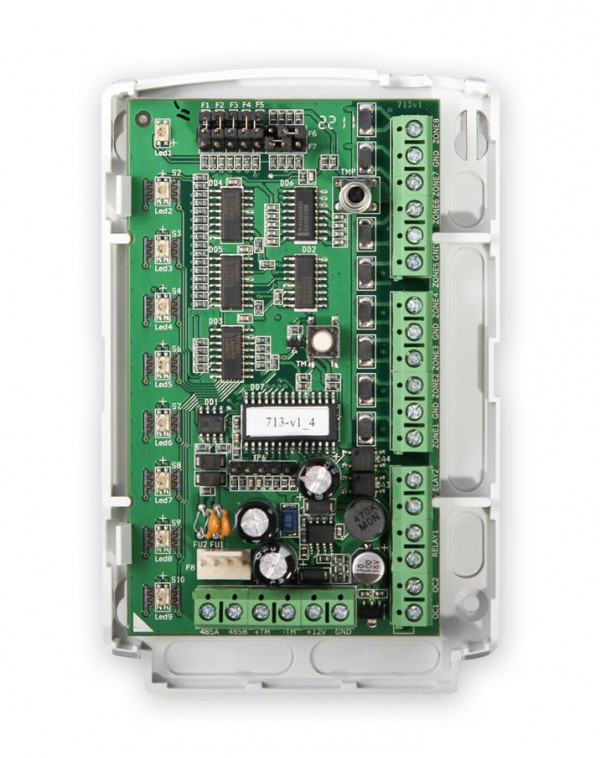 8 ШС с напряжением в шлейфах 14-21 В, возможность постановки-снятия ключами Touch Memory или кнопками пошлейфно на корпусе, 2 релейных выхода 100В х150мА и 2 выхода ОК 15В х 0,5А с предварительными типовыми заводскими настройками для целей СО, ЗО и ПЦН при автономном использовании, возможность цифрового обмена по RS-485 с перспективными центральными ППКОП и коммуникаторами. Выбор режимов работы с ПК