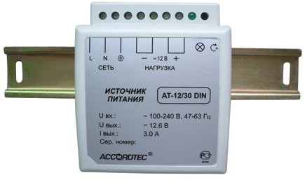 AT-12/15 - источник стабилизированного питания DC 12 V, номинальный ток нагрузки 1,5 A, с креплением на DIN-рейку, регулировка выходного напряжения.