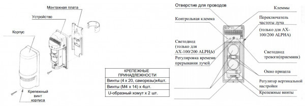 AX-100 Plus (Optex) - извещатель охранный линейный оптико-электронный 2-х лучевой активный в составе блоков: излучателя и приёмника предназначен для обнаружения проникновения через периметр охраняемого объекта и формирование извещения о тревоге путем переключения (1 НО и НЗ) выходных контактов оптоэлектронного реле.