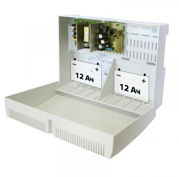 Резервированный источник питания; U-вых.20…28 В, I-вых.2.5 А(ном.), I-вых.3.5 А (max), U-вх.175…245 В, под два АКБ 12 В 7/12 А·ч; диагностический релейный выход "НАЛИЧИЕ СЕТИ", световая индикация режимов работы, защита от короткого замыкания, защита аккумулятора от глубокого разряда; IP20, t-раб.-10…+40°С, 333х240х134 мм. Пластиковый корпус.
