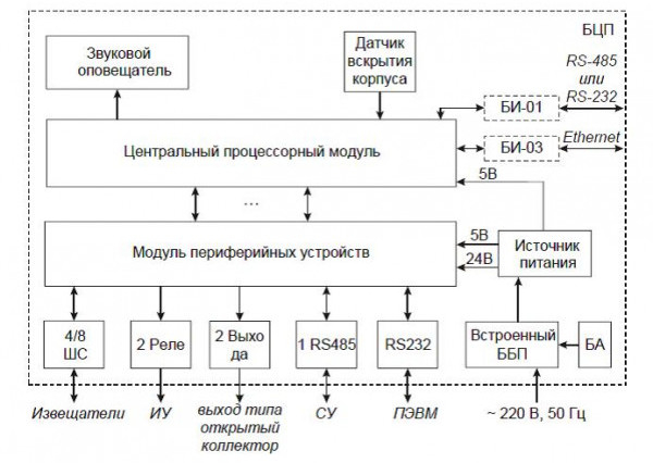 - для организации рабочего места оператора (при отсутствии ПЭВМ) применяется пульт управления ПУ-02 (конфигурирование БЦП, отображение состояния подключенного оборудования и т.п.);