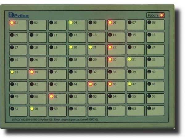 БИС-01 - блок индикации состояния зон, группы объектов ТС, отдельных объектов ТС, другого оборудования в пластмассовом корпусе, без встроенной консоли управления, со степенью защиты - IP40 входит в состав ИСБ "Индигирка".