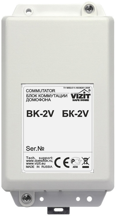 БК-2V - блок коммутации домофона предназначен для работы в составе видеодомофонов VIZIT серии 400 в качестве устройства коммутации линий видеосигналов от 2-ух блоков вызова в подъездную линию связи.
