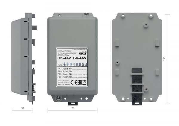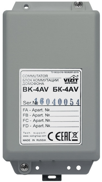 БК-4AV - блок коммутации домофона координатный предназначен для подключения 4-ёх абонентских мониторов или переговорных аудиоустройств к подъездной линии связи видеодомофонов VIZIT.