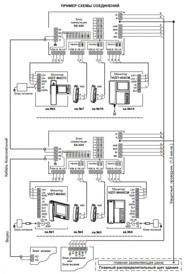 Этажный коммутатор (емкость до 4 абонентов) встроенный разветвитель видео сигнала с повышенной помехоустойчивостью. Подключение к защитному занулению.