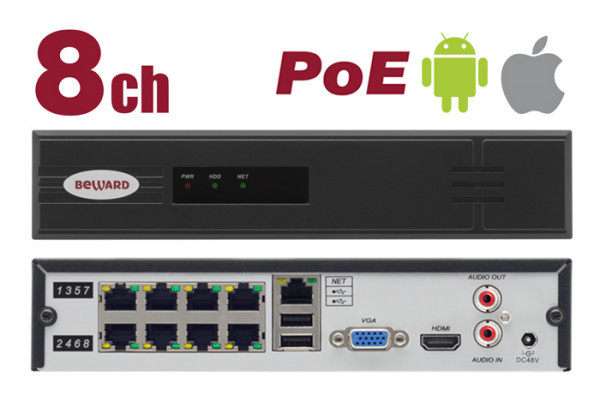 BK0108H2-P8 - сетевой IP - видеорегистратор с технологией PoE позволяет вести одновременную запись видео и звука на 8 каналов с видекамер разрешением до 8Мп (3840x2160).
