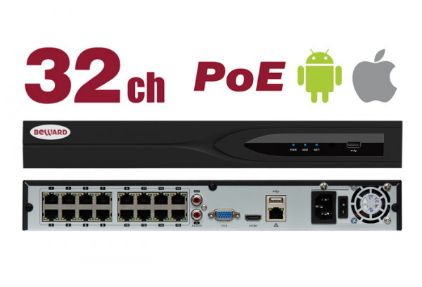 BK1232H2-P16 - сетевой IP - видеорегистратор с технологией PoE (для 16-и камер) позволяет вести одновременную запись видео и звука на 32 каналах с видекамер разрешением до 12Мп (4000х3000).