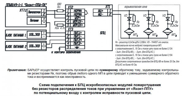 В качестве нагрузки в пусковой цепи могут быть следующие искробезопасные устройства: оповещатели, модули пожаротушения (МП), 4-х проводные извещатели и иные, удовлетворяющие требованиям совместимости по параметрам искробезопасности.