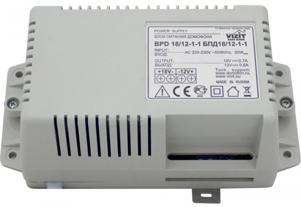 Блок питания нестабилизированный. Входное напряжение 190-240VAC. Выход 18V/0,7A, 12V/0,6A. Пластиковый корпус. Назначение для питания домофонов VIZIT совместно с замком.
