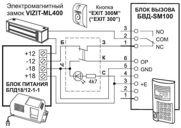 Внимание!!! В случае применения электромагнитного замка, для дублирования питания встроенных в блок вызова домофона кодового замка и контроллера ключей ТМ, рекомендуется установить в блоке питания перемычку между клеммами "-12" и "-18", а также диод (1N4007) между клеммами "+12" и "+18".
