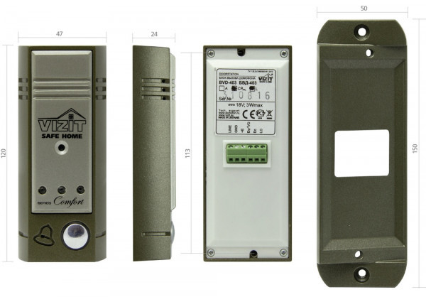 Блок вызова серии COMFORT на 1 абонента. Встроенная телекамера цветного изображения с функцией День-ночь (380 tvl, PAL,0 Lux / ИК подсветка для телекамеры, объектив PINHOLE 90 ). Подставка для поворота блока на 20 .