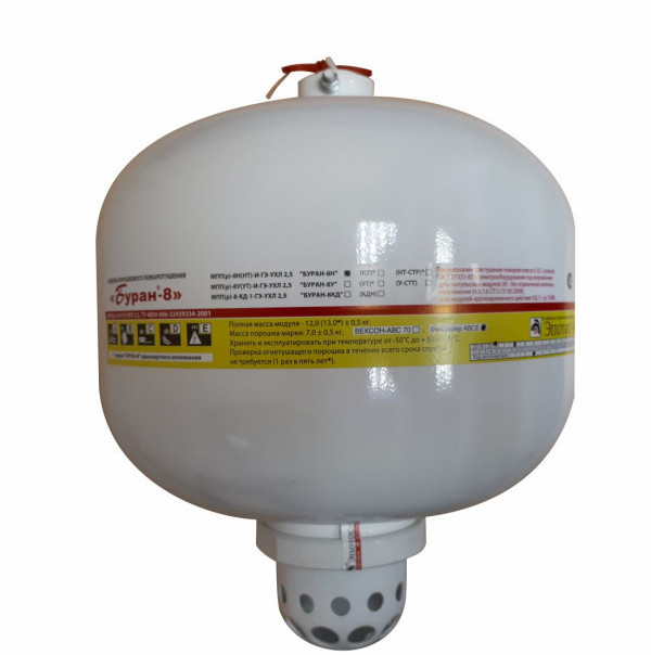 Буран-8Н - модуль импульсного порошкового пожаротушения (настенного крепления) в нормальном исполнении с температурным диапазоном эксплуатации (от -50 до +50°С), без режима самозапуска (при достижении определённой температуры срабатывания) - только электрозапуск предназначен для автоматического подавления очагов пожара классов А (твердых веществ), В (жидких веществ), С (газообразных веществ) и Е (электрооборудования, находящегося под напряжением без учёта параметра пробивного напряжения огнетушащего порошка).