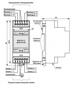 БЗЛ-05-12 (24) используется для защиты оборудования, подключенного к шлейфам сигнализации (извещатели охранные и пожарные, сетевые контроллеры шлейфов сигнализации СКШС), линиям связи и линиям вторичного питания систем сигнализации. БЗЛ-05 содержит – два канала защиты линии (шлейфы сигнализации или линии электропитания)