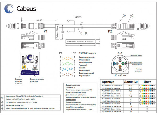 Cabeus PC-UTP-RJ45-Cat.5e-3m - патч-корд (коммутационный шнур U/UTP, оболочкой - PVC, категории - 5е, с разъемами: RJ-45 - 2шт.) серого цвета, неэкранированный и длинной - 3м для подключения оборудования к кабельной системе, а также для коммутации портов в кроссовых узлах между портами активного оборудования и патч-панелями.