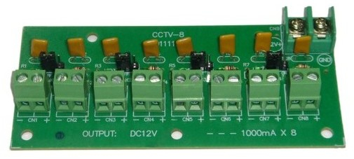 CCTV-8 - защитно-коммутационное устройство для распределения тока от источника питания по 8-ми каналам, с защитой по току и индикацией каждого из каналов.