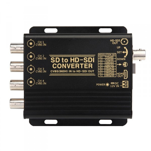 Преобразователь композитного сигнала (до 960H) в HD-SDI или HDMI сигнал. Расстояние передачи 100 м (1920х1080, 60p), 150 м (1920х1080, 60i). Вх.- BNC(CVBS, 960H)х4/клм.(DC 12V) , вых.- BNC(HD-SDI)/ HDMI(A). БП DC 12V (500mA) в комплекте. OSD-меню номер канала, название. Возможен вывод изображения в режиме квадратора. Размеры 93 x 93 x 35 мм. Рабочая температура 0...+50 С.