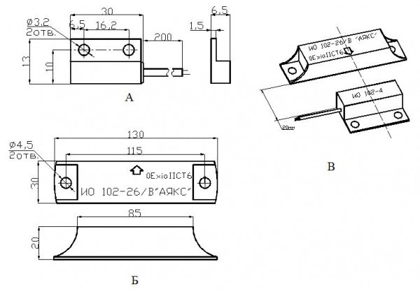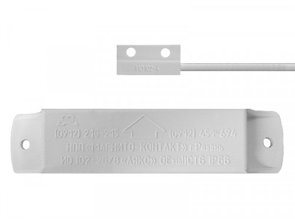 ДП 102-4 НЗ - извещатель охранный точечный магнитоконтактный с нормально-замкнутого типа (НЗ) контактами, в корпусе: геркон - из пластика, усиленный магнит - антистатический пластик во взрывозащищенном (0ExiaIICT6) корпусе (ИО 102-26/В «Аякс»), с проводным выводом в обычной изоляции и длиной (0,2м) без защитного рукава и предназначенным для организации устройств типа «ловушка», блокировки дверных и оконных проемов, а также других конструктивных магнитопроводящих (металлических) и магнитонепроводящих (алюминиевых, деревянных и т.д.) элементов зданий и сооружений на закрывание/открывание и смещение с выдачей в шлейф (НО/НЗ) приёмно-контрольного прибора извещения о тревоге путем размыкания/замыкания контактов геркона.