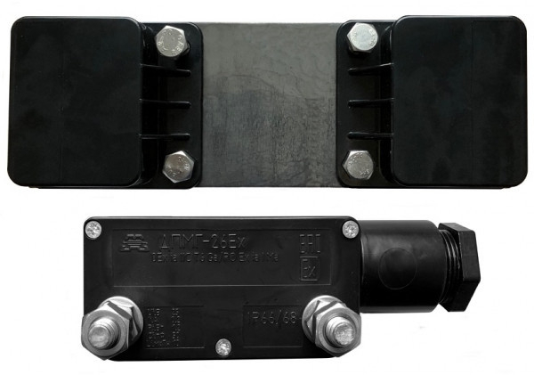 ДПМГ-26Ех исп.200 - извещатель охранный искробезопасный точечный магнитоконтактный взрывозащищённый (0ExiaIICT6Ga/РОExiaIMa) с нормально-открытого типа (НО) контактами, в антистатическом пластиковом корпусе, с болтовыми клеммами для подключения проводных выводов и предназначенным для контроля положения перемещающихся отдельных конструкций и механизмов из магнитопроводных (металлических) и не магнитопроводных (алюминиевых, деревянных и т.д.) материалов при выполнении различных технологических процессов во взрывоопасных зонах на открывание и смещение с выдачей в шлейф приёмно-контрольного прибора извещения о тревоге путем размыкания контактов геркона.