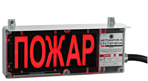 ЭКРАН-С-К2-220VАC ПОЖАР - взрывозащищенный световой оповещатель (Табло) с дополнительной световой секцией - "АВТОМАТИКА ОТКЛЮЧЕНА" (или другой по заявке), постоянным или мигающим свечением надписи, внутренней искробезопасной цепи (ib) и напряжением питания (100 - 240В) предназначен в качестве средства оповещения в системах пожарной сигнализации во взрывоопасных зонах.