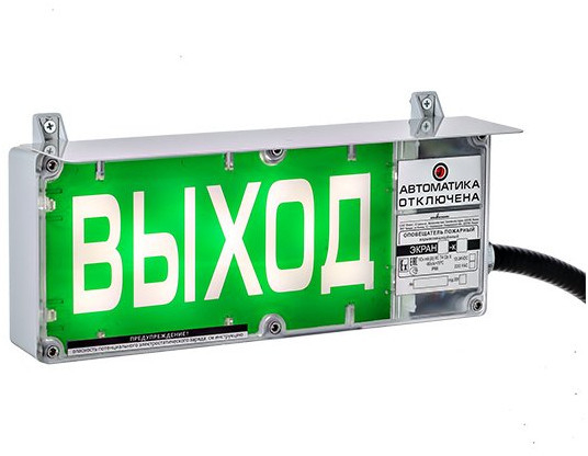 ЭКРАН-С-К2-220VАC ВЫХОД - взрывозащищенный световой оповещатель (Табло) с дополнительной световой секцией - "АВТОМАТИКА ОТКЛЮЧЕНА" (или другой по заявке), постоянным или мигающим свечением надписи, внутренней искробезопасной цепи (ib) и напряжением питания (100 - 240В) предназначен в качестве средства оповещения в системах пожарной сигнализации во взрывоопасных зонах.