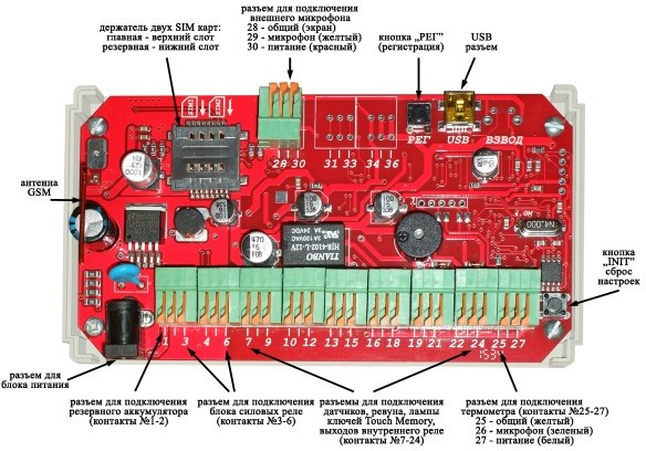 Четыре проводные аналоговые зоны, три многорежимных реле, голосовое информационное меню и меню управления ,контроллер ТМ, контроль силового питания и АКБ, автоконтроль баланса карты,защита доступа по АОН и паролю