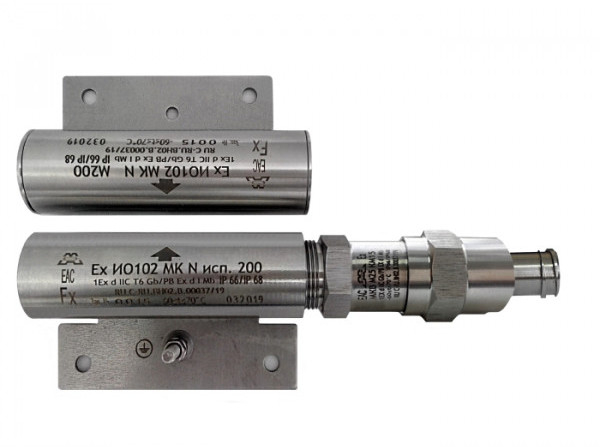 Ех ИО102 МК N исп.200 с магнитом М-100 КМ20 - извещатель цилиндрической формы охранный взрывозащищённый (1ExdIICT6…Т5Gb или РBExdIMb) точечный магнитоконтактный с нормально-открытого типа (НО) контактами исполнительного блока (геркона), в корпусе из нержавеющей стали (12Х18Н10Т), с кабельным вводом для присоединяемого кабеля (диаметр: 6 - 12мм) в металлорукаве (КМ20 - диаметр 20мм), в комплекте с магнитом (М100) и предназначенным для контроля положения частей конструкций и механизмов, других конструктивных магнитопроводящих (металлических) и магнитонепроводящих (алюминиевых, деревянных и т.д.) элементов зданий и сооружений на открывание и смещение с выдачей в шлейф приёмно-контрольного прибора извещения о тревоге путем размыкания контактов геркона.