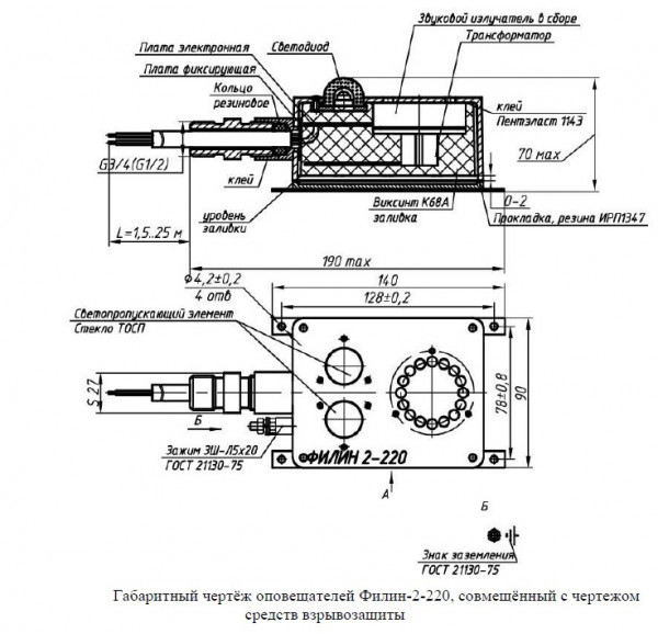 ФИЛИН 2-220 - оповещатель пожарный взрывозащищенный (1ExmbdbIICT6GbX), светозвуковой (прерывистый - свет, 105 дБ - непрерывный звук по схеме: при подаче напряжения), степенью защиты (IP66/67), напряжением питания (187 - 264 В), с присоединённым кабелем (муфта с резьбой G1/2" на торце корпуса) длиной (1,5м; другой размер - до 25 под заказ) предназначен для подачи светового и звукового сигналов в системах пожарной и охранной сигнализации при совместной работе с любыми приемно-контрольными устройствами и применяется на предприятиях химической, нефтегазодобывающей, нефтегазоперерабатывающей отраслей и взрывоопасных зонах (1 и 2 классов) других производств.