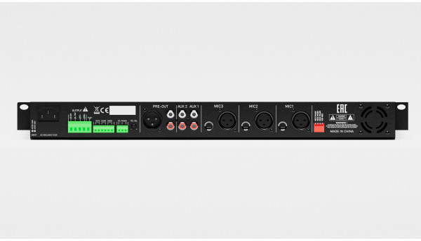 Один канал, мощность на выходе составляет 60 Вт. Возможно подключение как трансляционных (напряжение в линии 70/100В), так и низкоомных (импеданс линии 4-16 Ом) акустических систем. Важно отметить, что одновременно можно применять акустику только одного типа. Диапазон воспроизводимых частот 80 Гц - 20 кГц.