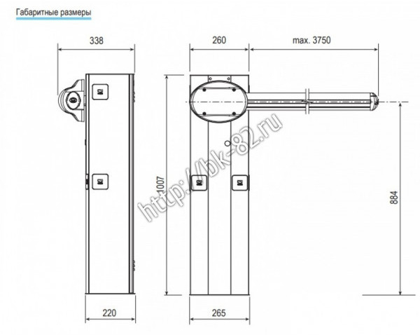 G3750 - тумба быстродействующего шлагбаума право- или левосторонняя (указать при заказе) без стрелы (овальная или круглая алюминиевая - приобретается отдельно) для ширины проезда до 3,75м, с встроенными: электромеханическим приводом с напряжением питания DC(24)В и блоком управления (ZL38) напряжением питания 230В.