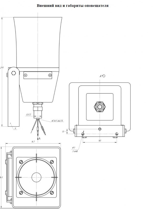 Крепление оповещателя осуществляется через кронштейн (в комплекте поставки) 3-мя винтами (шурупами).