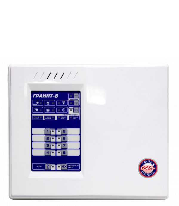 Прибор приемно-контрольный Гранит-8А, 8 зон, GSM-терминал, автодозвон по линиям ГТС, речевые сообщения, РИП, программирование через ПК (USB).