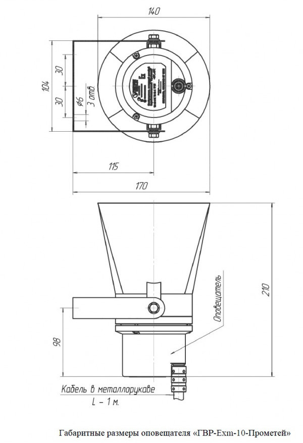 ГВР-Exm-10-Прометей - оповещатель рупорный пожарный взрывозащищенный (1ExmbdIICТ6GbX), речевой (100 дБ) и мощностью - 10 Вт, степенью защиты (IP66), с кабельным ввводом в металлическом гофрошланге длиной (1м), из алюминиевого сплава и ABS-пластика предназначен для трансляции речевых сообщений и иной звуковой информации с внешних источников сигнала в системах пожарной и охранной сигнализации при совместной работе с трансляционными усилителями всех отечественных и зарубежных производителей и применяется на предприятиях химической, нефтегазодобывающей, нефтегазоперерабатывающей отраслей и взрывоопасных зонах (1 и ниже классов) других производств.