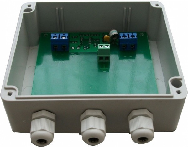Герметич. коробка с каб.гермовводами (3шт.), для установки на улице, крепление кабелей на плате под винтовые колодки, габариты коробки 125х115х56+B135 мм3. Для коаксиального кабеля