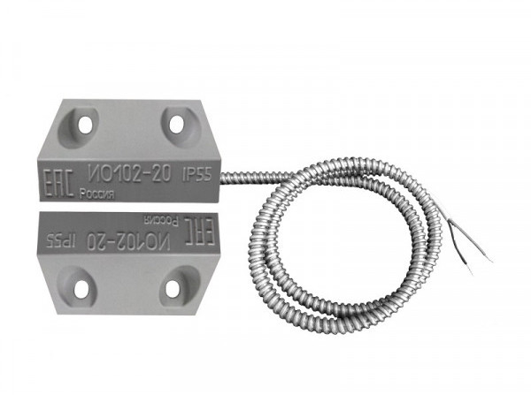 ИО 102-20 Б2П (3) - извещатель накладной охранный точечный магнитоконтактный с нормально-открытого типа (НО) контактами, в корпусе из пластмассы и цвета (белый, серый, чёрный - указать в заказе), с проводным выводом в металлическом гофрорукаве и длиной (0,6м) предназначен для блокировки гаражных ворот, ангаров, железнодорожных контейнеров, телефонных шкафов и других конструктивных магнитопроводящих (металлических) и магнитонепроводящих (алюминиевых, деревянных и т.д.) элементов зданий и сооружений на открывание и смещение с выдачей в шлейф приёмно-контрольного прибора извещения о тревоге путем размыкания контактов геркона.