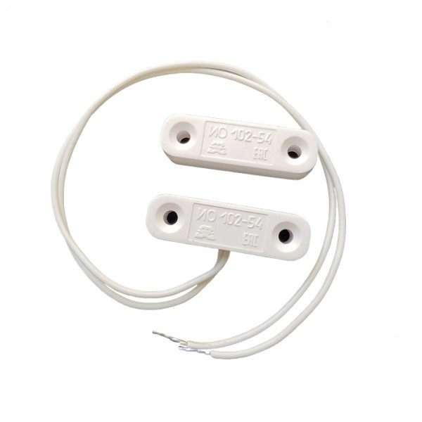ИО 102-54 - извещатель накладной охранный точечный магнитоконтактный с нормально-открытого типа (НО) контактами, в корпусе из пластика и цвета (белый, чёрный, коричневый, терракотовый - указать в заказе), с проводным выводом в обычной изоляции и длиной (0,19м; другая - под заказ) без защитного рукава предназначен для организации устройств типа «ловушка», блокировки дверных и оконных проемов, а также других конструктивных магнитопроводящих (металлических) и магнитонепроводящих (алюминиевых, деревянных и т.д.) элементов зданий и сооружений на открывание и смещение с выдачей извещения о тревоге на пульт централизованного наблюдения, прибор приёмно-контрольный или концентратор путем размыкания контактов геркона.