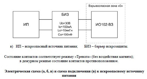 Данный извещатель включается в искробезопасные шлейфы сигнализации ППКОП, искробезопасные электрические цепи которых имеют параметры, позволяющие подключать данный извещатель.