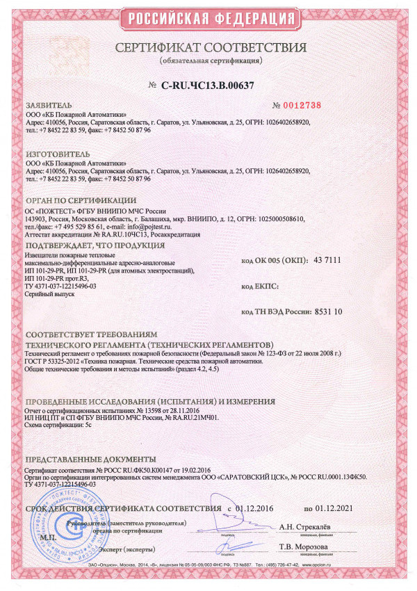 ИП 101-29‑PR исп.01 - извещатель пожарный тепловой максимально-дифференциальный адресно-аналоговый с площадкой для крепления кабеля, с розеткой для накладного крепления к потолку предназначен для обнаружения загораний, сопровождающихся повышением температуры внутри контролируемого пространства в закрытых помещениях различных зданий и сооружений и передачи сигнала «Пожар» в приемно-контрольный прибор «Рубеж-4А», «Рубеж-2ОП», ППКПУ серии «Водолей».