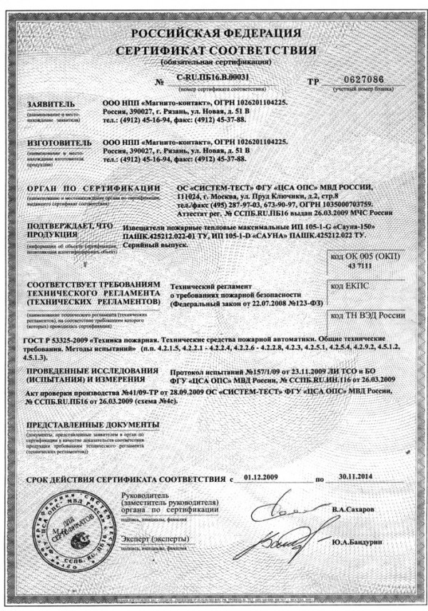 - Извещатель пожарный тепловой максимальный ИП 105-1 Д (Сауна)