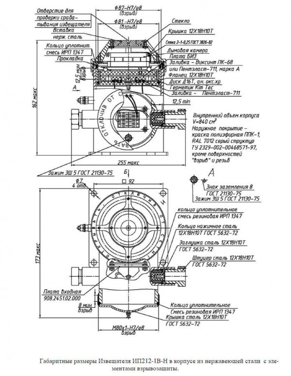 ИП 212-1В-Н-ТG1/2 - извещатель из нержавеющей стали пожарный искробезопасный дымовой взрывозащищенный (1ExdbiaIIBT6GbX), степенью защиты (IP31 - элементы электрической схемы и IP54 - оболочка) для трубной (1/2") прокладки кабеля диаметром (8 - 12мм) и выдачи в шлейф пожарной сигнализации тревожного сигнала «Пожар» за счёт скачкообразного уменьшения сопротивления извещателя при его параллельном включении в ШС и применяется на предприятиях химической, нефтегазодобывающей, нефтегазоперерабатывающей отраслей и взрывоопасных зонах класса (1 и ниже) других производств.