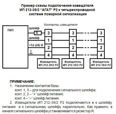 ИП 212-39/2 (АГАТ) Р2 - точечный дымовой 4-х проводный оптикоэлектронный пожарный извещатель, токопотребляющий, восстанавливаемый (многократного действия), обычного исполнения предназначен для обнаружения загораний, сопровождающихся появлением дыма, и передачи на ППКОП сигнала тревожного сообщения (Пожар) за счёт замыкания (1 НО) контактов оптоэлектронного реле извещателя.