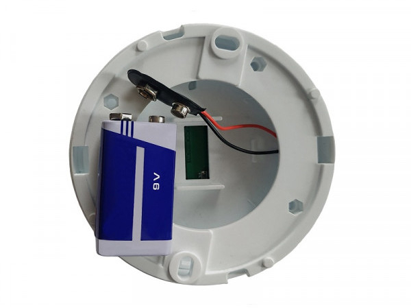 Питание извещателя осуществляется от 1-ой батарейки (Крона - приобретается отдельно), устанавливаемой со стороны задней стенки под съемной крышкой.