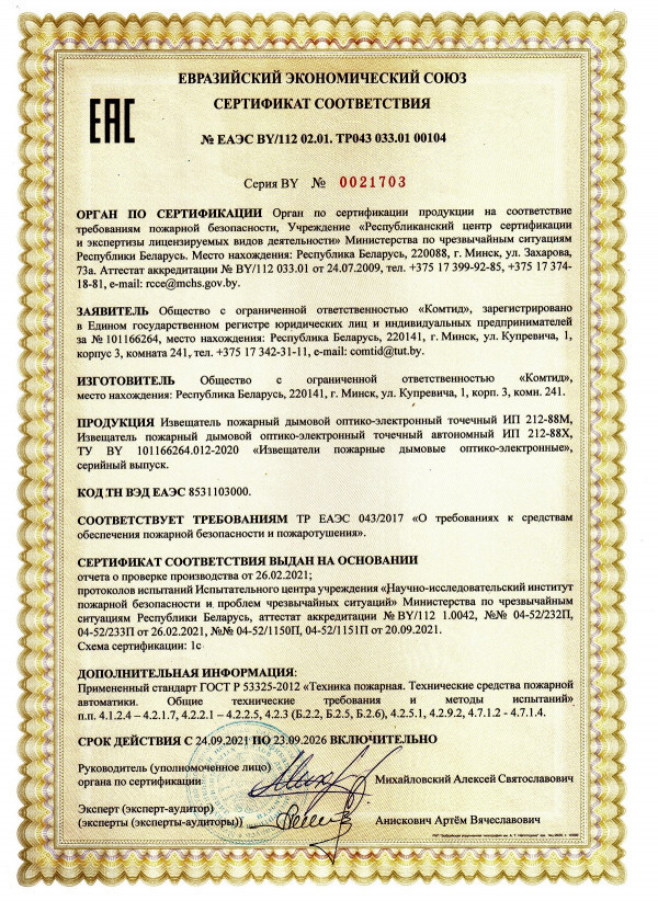 ИП 212-88М - точечный дымовой 2-ух проводный оптикоэлектронный пожарный извещатель, токопотребляющий, восстанавливаемый (многократного действия), обычного исполнения предназначен для обнаружения загораний, сопровождающихся увеличением плотности задымления, и передачи на ППКОП сигнала тревожного сообщения (Пожар).