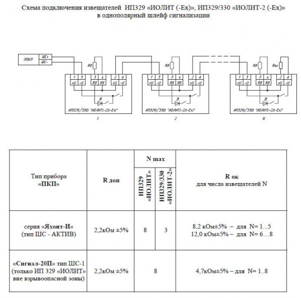 Для работы извещателя с приборами серии Яхонт-И при выпуске производителем устанавливается внутренний токоограничительный резистор сопротивлением 2,2 кОм, при работе с другими ППКП - устанавливается другой необходимый для него резистор.