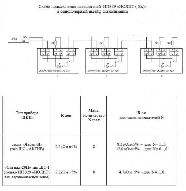 Для работы извещателя с приборами серии Яхонт-И при выпуске производителем устанавливается внутренний токоограничительный резистор сопротивлением 2,2 кОм, при работе с другими ППКП - устанавливается другой необходимый для него резистор.