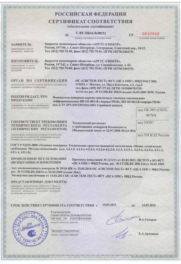 - Подтверждение ФГБУ ВНИИПО МЧС России о возможности установки одного извещателя в защищаемом помещении