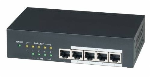 Коммутатор PoE 5-портовый, 10/100/1000M, поддерживает стандарт IEEE 802.3af, 4 порта со встроенным PoE-инжектором + 1 порт для подключения к сети LAN. Автоопределение PoE-устройств. Встроенный блок питания. Размеры 167x96x40 мм.