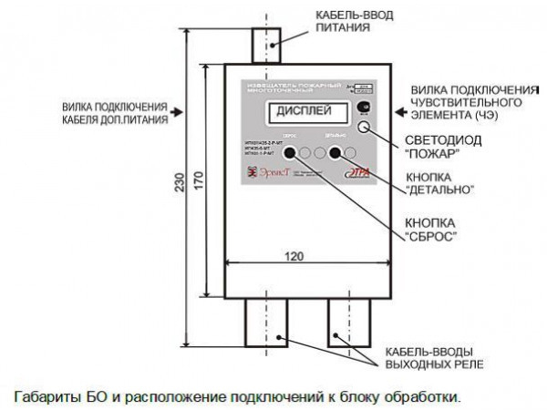 ИП101/435-2-Р-МТ-БО - блок обработки сигналов (БО) от отрезков участков кабельных хвостов (24 м) и общей их длиной до 1440 м чувствительных элементов - извещателей пожарных комбинированных - тепловых и газовых (угарного газа - СО) многоточечных линейных адресных в виде процессорного кабеля, подключаемых между собой через узловые контроллеры (УК), степенью защиты (IP54), наличием ЖК - дисплея предназначен для выявления признаков пожара (с точным определением расстояния до очага возгорания) и формирования извещений на реле: Пожар (НО) -20шт. и Неисправность (НЗ) - 1шт., а также обеспечивает питание данных извещателей.