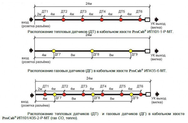ИП101/435-2-Р-МТ-КХ - кабельный хвост (КХ) извещателя пожарного комбинированного - теплового и газового (угарного газа - СО) многоточечного линейного адресного в виде процессорного кабеля, степенью защиты (IP54) представляет собой законченный отрезок кабеля длиной - 24м, входной розетки разъёма, вилки выхода узлового контроллера (УК), встроенными цифровыми тепловыми и газовыми датчиками (1-wire), расположенными друг от друга на расстоянии - 4м (тепловые) и 8м (газовые).