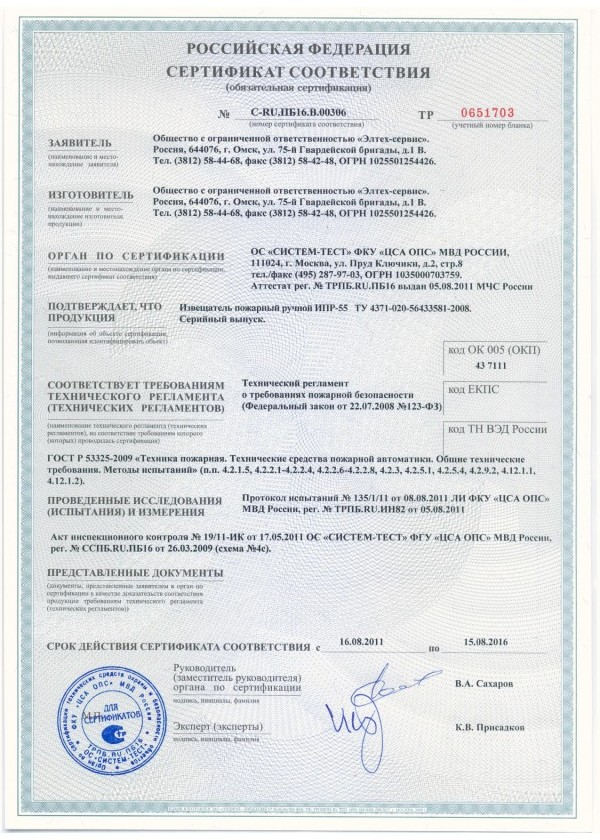 Извещатель пожарный ручной, питание 18 - 24 В, 350 мкА, с кнопкой