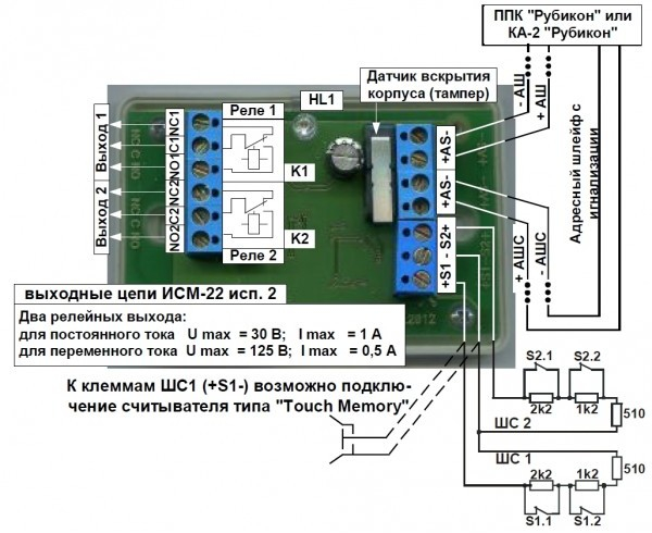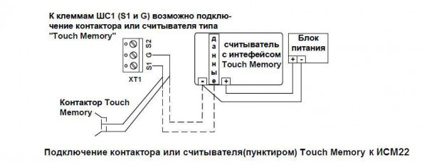 К клеммам ШС1 возможно подключение считывателя типа «Touch Memory».